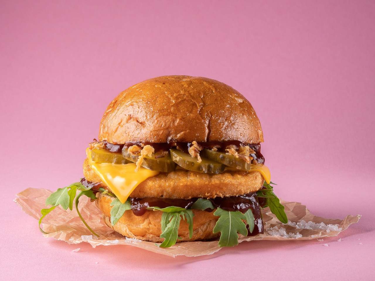 280г Булочка для бургера, філе курчати-бройлера в паніровці, сир "Чеддер", помідор, перець конфі, айсберг, огірок маринований, соус барбекю з димом, масло вершкове, гірчиця "Американська".100г:209,9 ккал/Б9,47/Ж9,13/В21,86