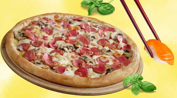 Соус томатний, сир моцарела, соковита шинка та солодка кукурудза, гриби печериці, копчене куряче філе, свіжа зелень