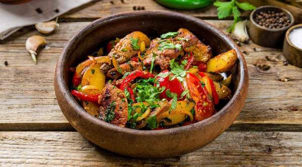 Томлене куряче філе з цибулею, солодким перцем, томатами та спеціями. Подається з вареним рисом