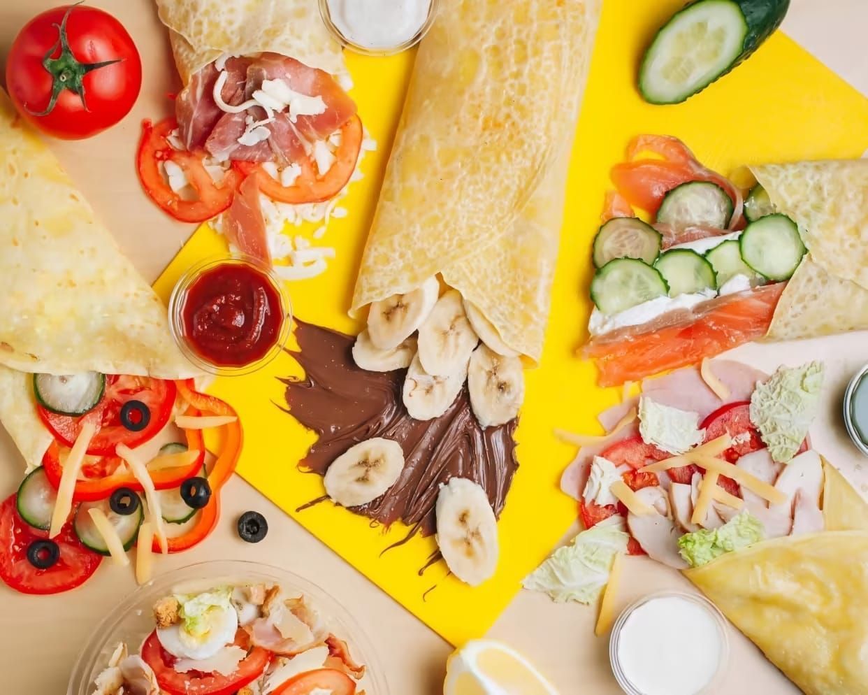 Млинець, банан свіжий, Нутела, кокосова стружка, горішки, заварний крем