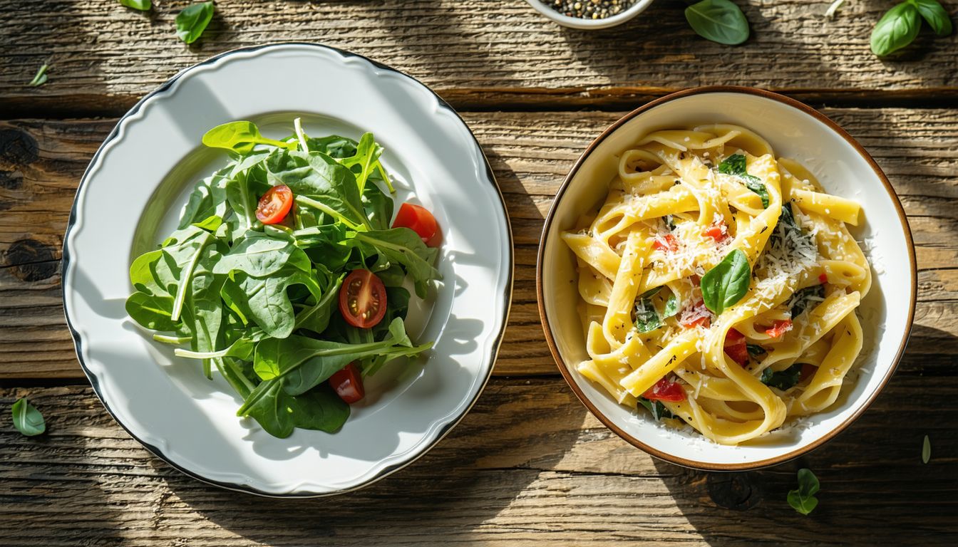 Паста фетучіні в томатному соусі з кереточним біском, з креветками обсмаженими на вершковому малі з часником, петрушкою, цедрою лимона та цибулею шніт
