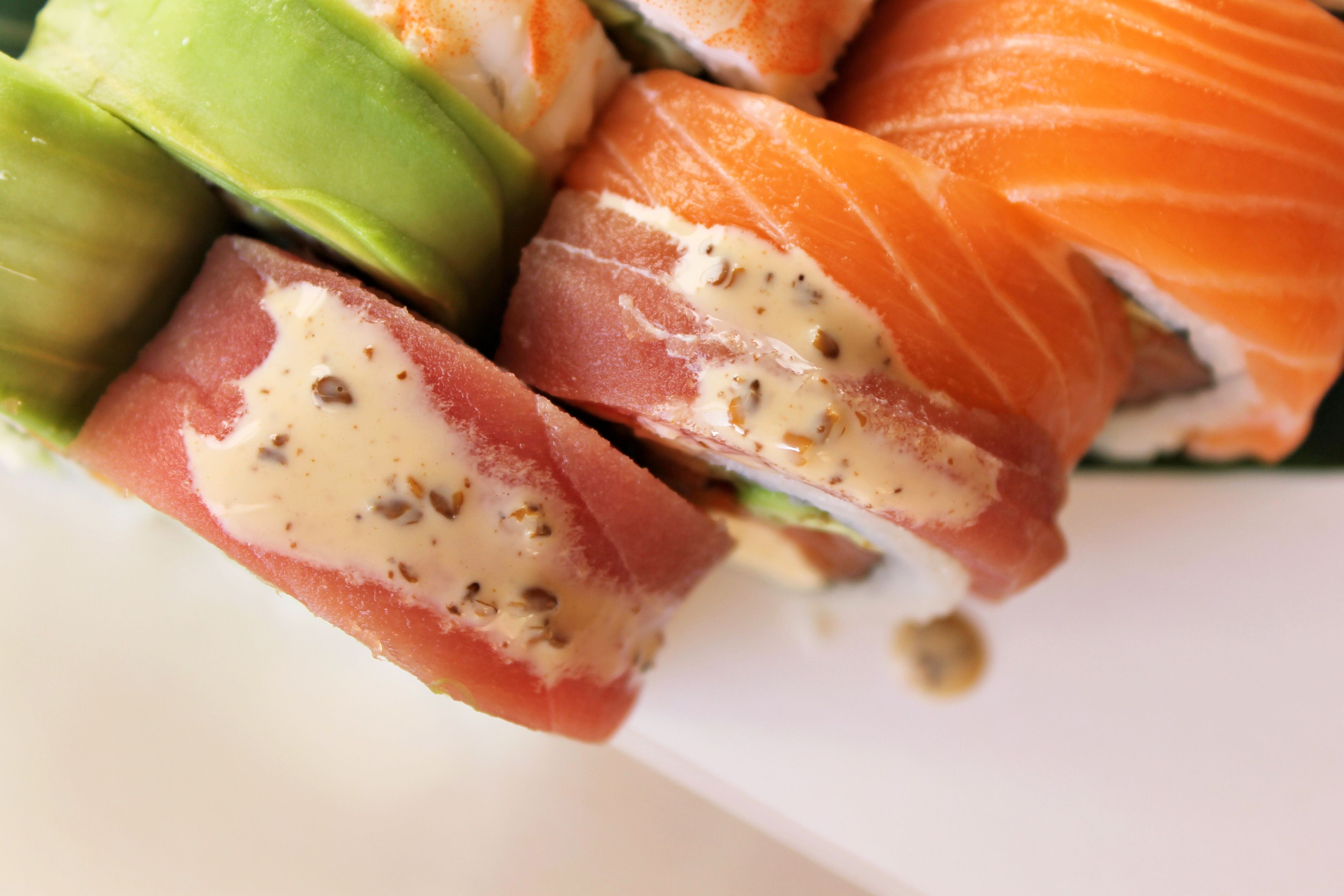 Рис, тунець, авокадо, такуан, ікра Тобіко, крем-сир, горіховий соус, кунжут, норі, огірок Соєвий соус, імбир, васабі