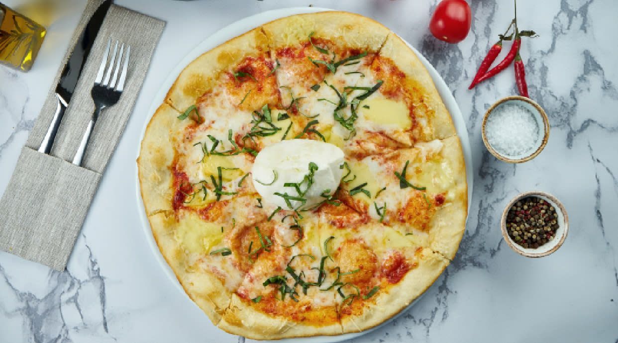 Дор блю, пармезан, креметте, голандський, моцарела, ароматна олія, орегано, вершковий соус. 30см/490г