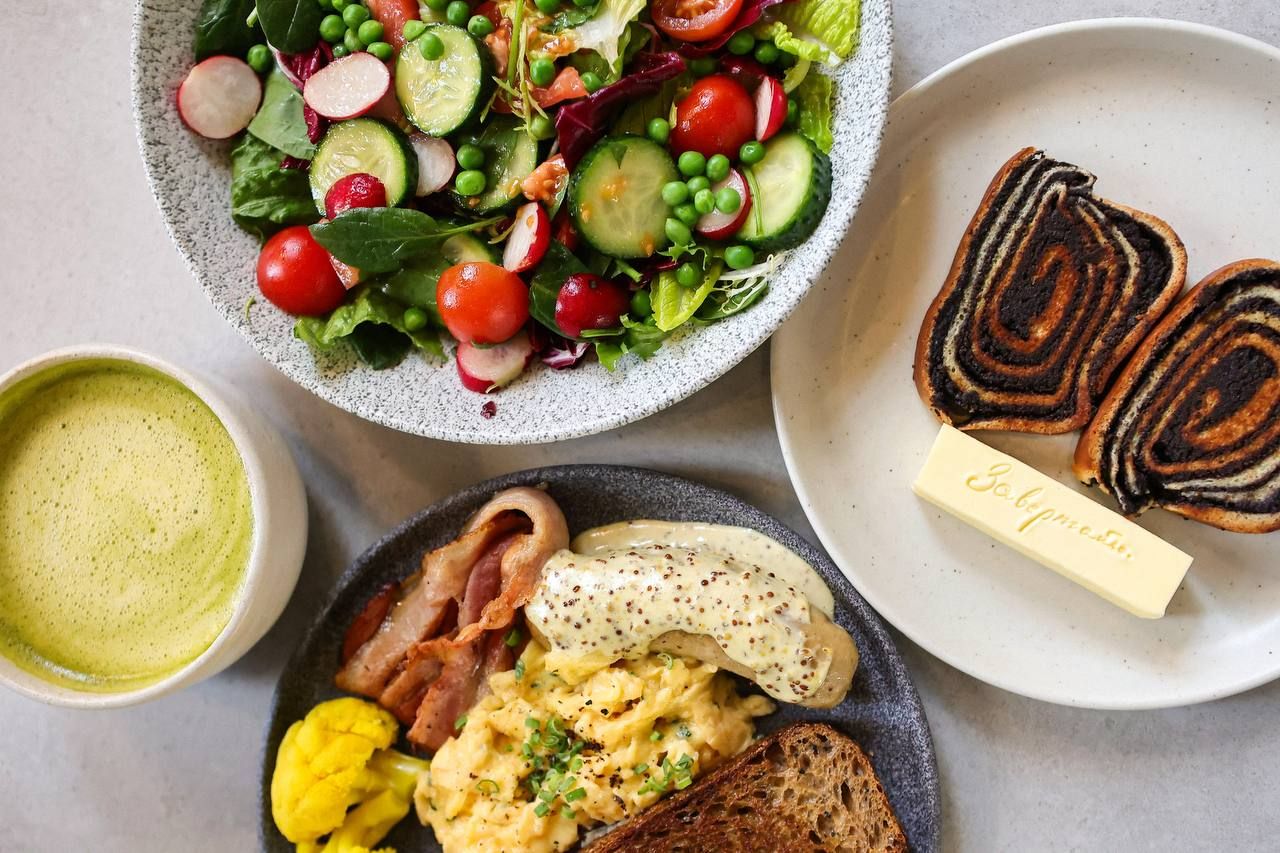 Подаємо його весь день у такому складі: шмат хліба, сир гауда, свіжа зелень, збите вершкове масло, печений буряк посипаний дуккою, маринована цвітна капуста, томатний джем. Алергени: глютен, молочні продукти, мед.
