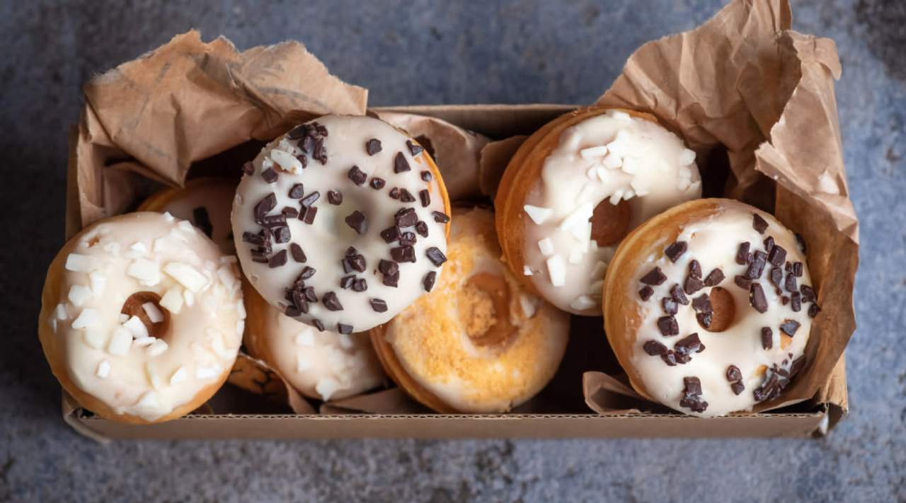 4 пончика з топлленой полуничною глазур'ю , 4 пончика з топлленой шоколадною глазур'ю , 2 пончика з топленой лайм глазур'ю