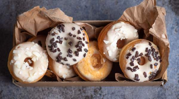 3 пончика з цукровою пудрою , 3 пончика з топленой шоколадною глазур'ю , 3 пончика з топленой полуничною глазур'ю , 3 пончика з топленой лайм глазур'ю