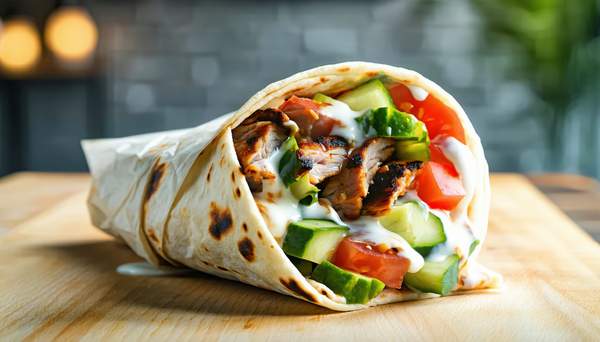 Лаваш, курка, Айсберг, Пармезан, сир Чедер, помідор, оірок маринований, Червоний соус, Чесночний соус