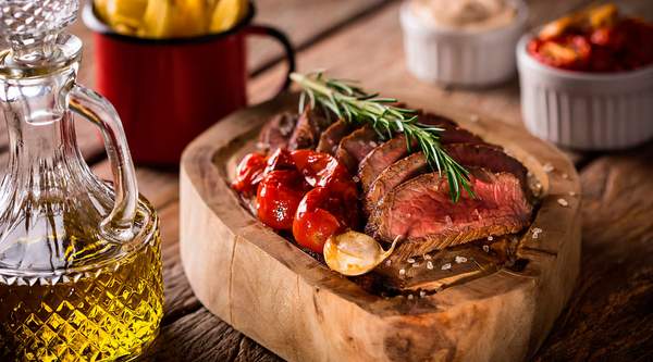 з яйцями, соусом дзадзикі, картоплею, чері, горошком, беконом, італійськими травами та хлібом на заквасці власного виробництваХарчова цінність: білки - 61 г; жири - 100 г; вуглеводи - 38 г