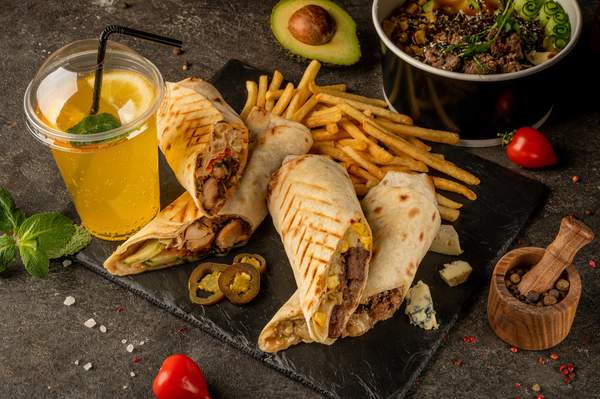 Лаваш, соус світ Чилі білий, айсберг, сир Дор Блю, сир сулугуні, сир Моцарела, смажена телятина, соус медово-гірчичний