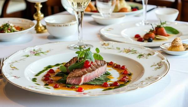 Салат Ромен, томати Черрі, гриби Печериці, спаржева квасоля, насіння гарбуза, соус Медово-Гірчичний, вершковий крем з червоним соусом Песто, вирізка з телятини