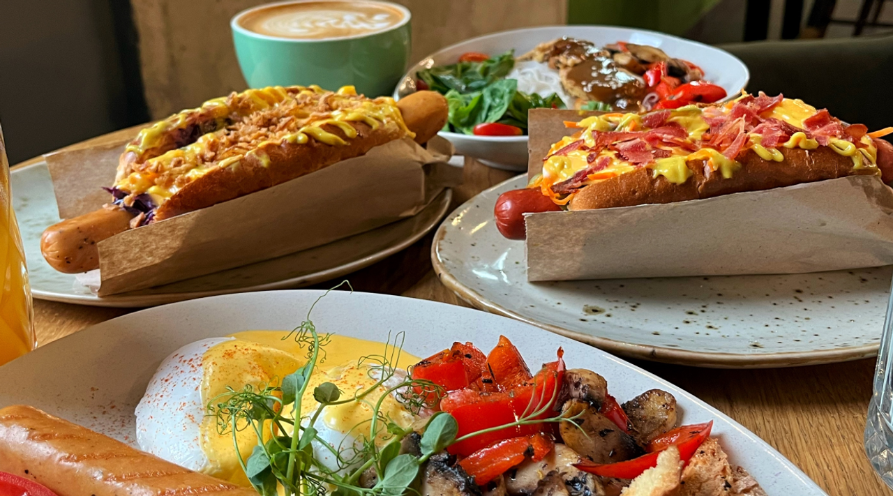 Яйця пашот, куряча ковбаска, печериці, болгарський перець, гуакамоле, томати чері, сирний соус, мікрогрін, копчена паприка, хліб пшеничний