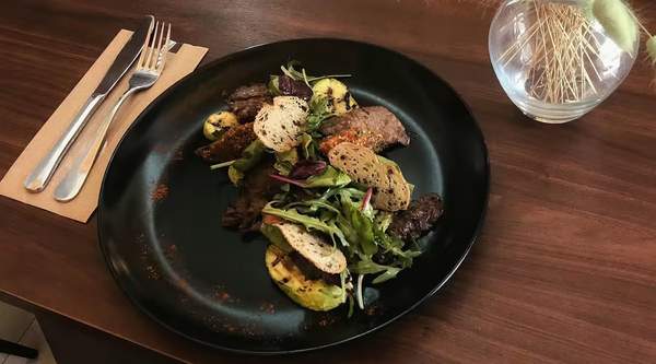 Яловича вирізка, цибуля марс, огірок маринований, гірчична заправка, перепелиний жовток, перець чилі, грінки з багету