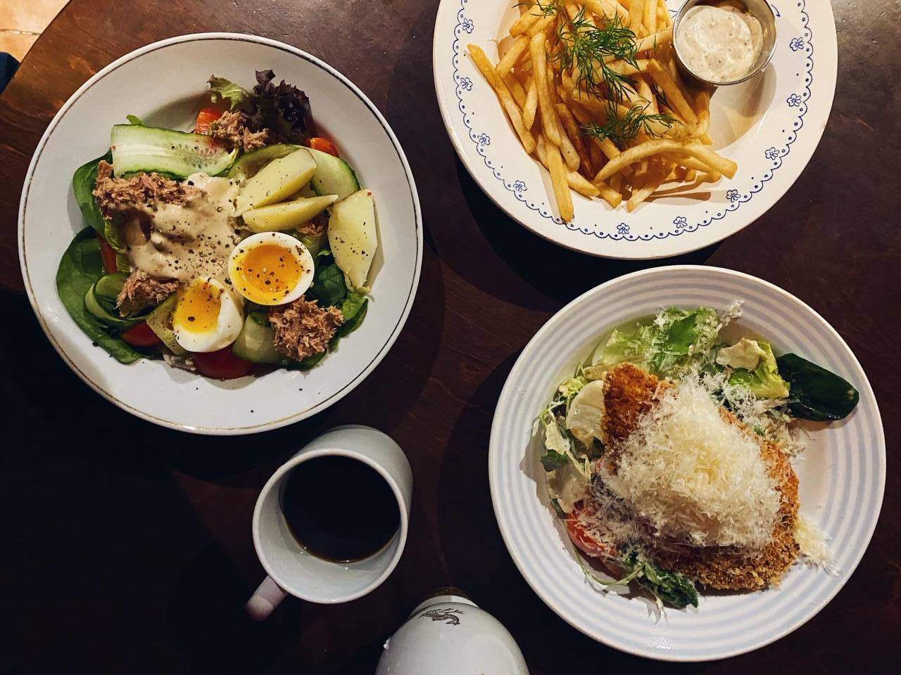 Мікс салатів, свіжі томати, соус на основі тунця, курячий шніцель маринований зі спеціями карі, в паніровці з сухарів панко, присипаний пармезаном