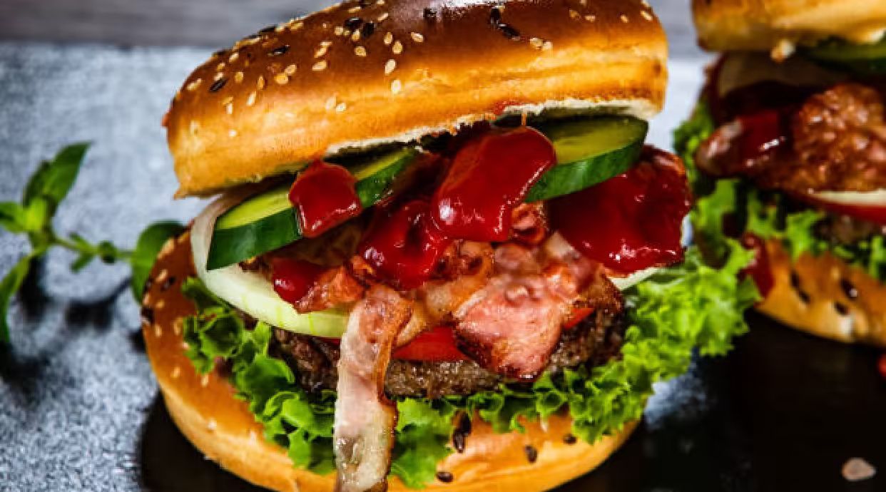Соковита котлета з яловичини, підсмажений бекон, яйце Пашот, томати, хрусткі кільця цибулі, сир Чедер, мікс салату, гірчиця, кетчуп