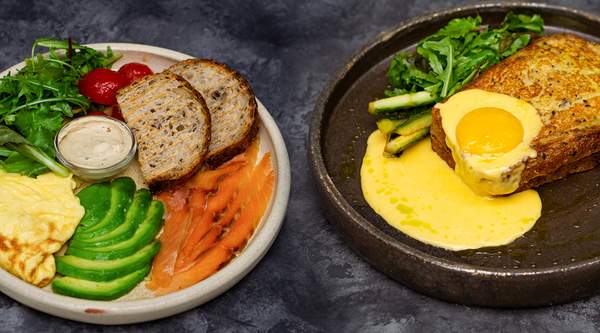 Омлет, лосось гравлакс, авокадо, чері кім чі, мікс салату, хліб на заквасці, соус яблуко-базилік, масло з анчоусів