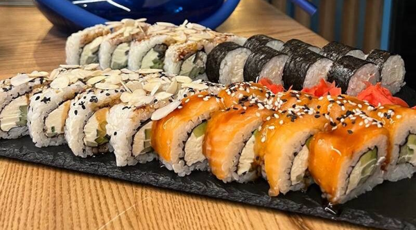 Каліфорнія з лососем в кунжуті, каліфорнія з вугрем в кунжуті, філадельфія з лососем, футо-макі з крабом