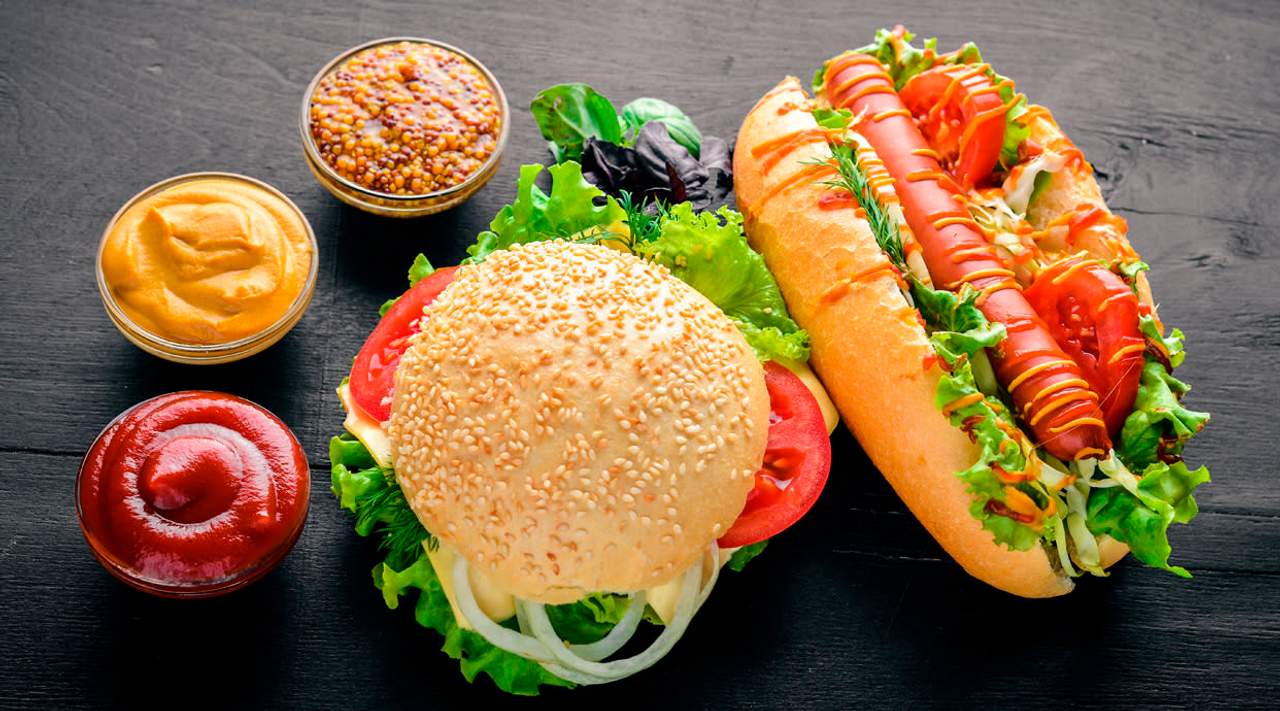 Булочка, мисливська ковбаска, сир, томати, огірки, салат, фірмові соуси, гірчиця