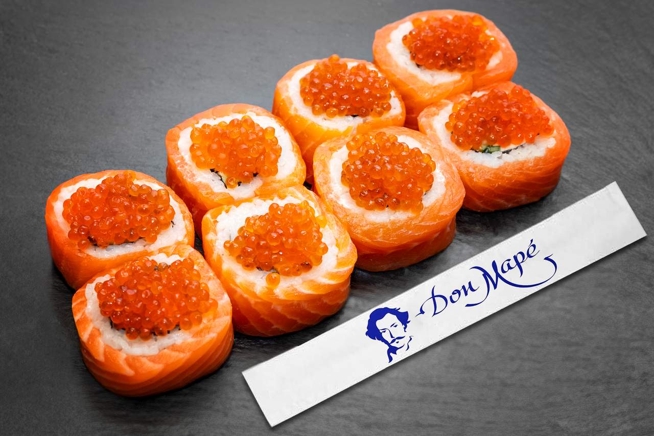 Рис, лосось, майонез Японія, ікра летючої риби Тобіко, соус Кімчі, водорості норі