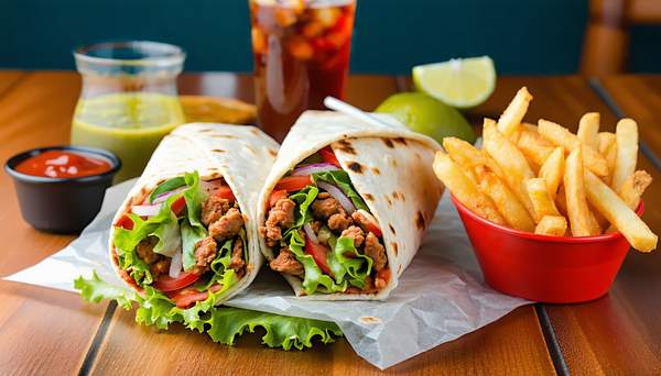 Лаваш, куряче м'ясо, пекінка, томати, морква по-корейськи, солений огірок, гриби шампіньйони, цибуля червона, соус
