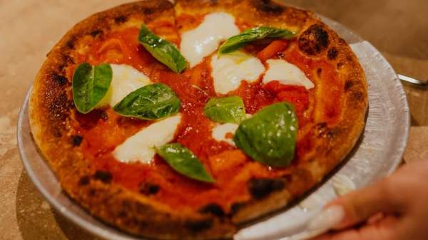 Піца на томатній основі з сиром моцарела, томатами та соусом песто. Подаємо з соусом до бортиків.