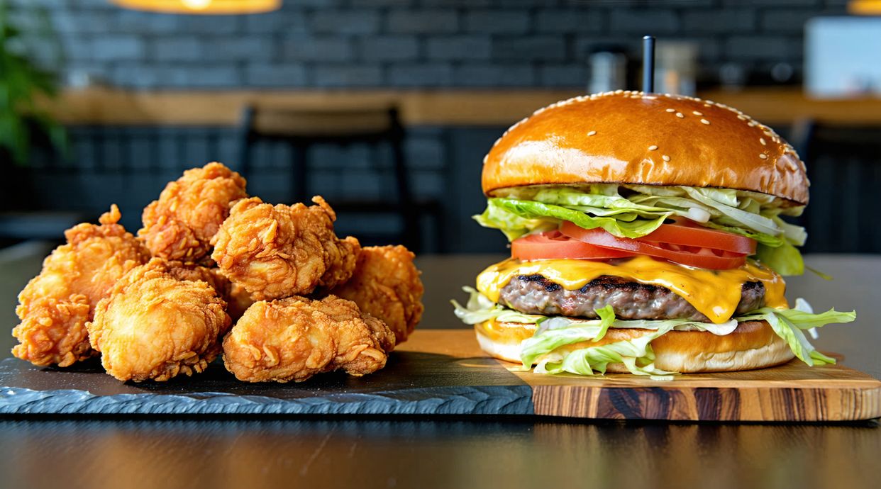 A hearty burger stacked with two juicy chicken fillets, fresh toppings, and house sauce