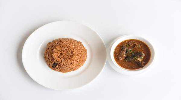 A plate of well spiced traditional rice, comes with a piece of Chicken and a drink