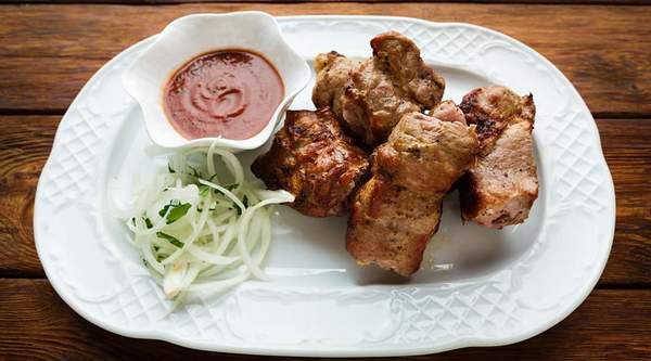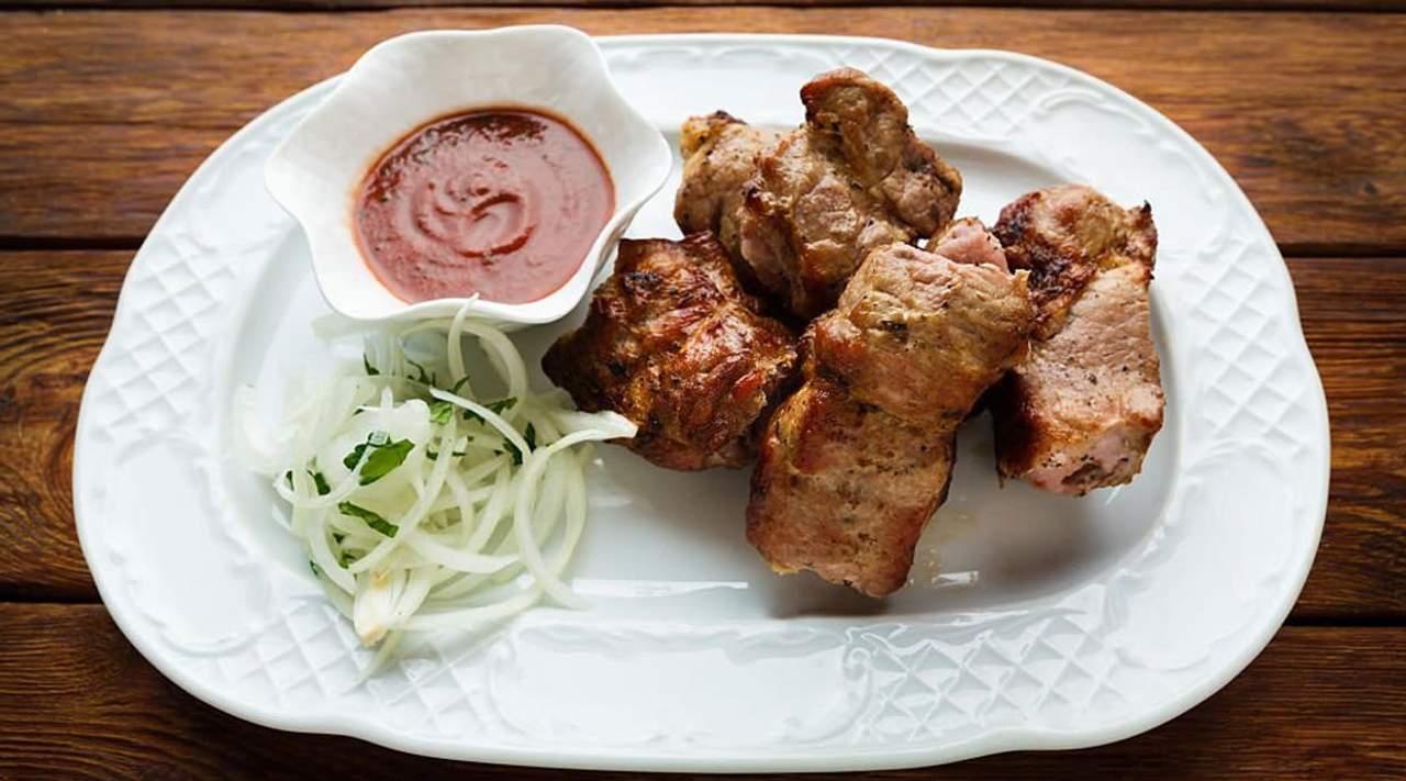 1/2 kg of pork without fat skin ( ekigodo ) dry fried served with pressed matooke, cassava, avocado and kachumbari
