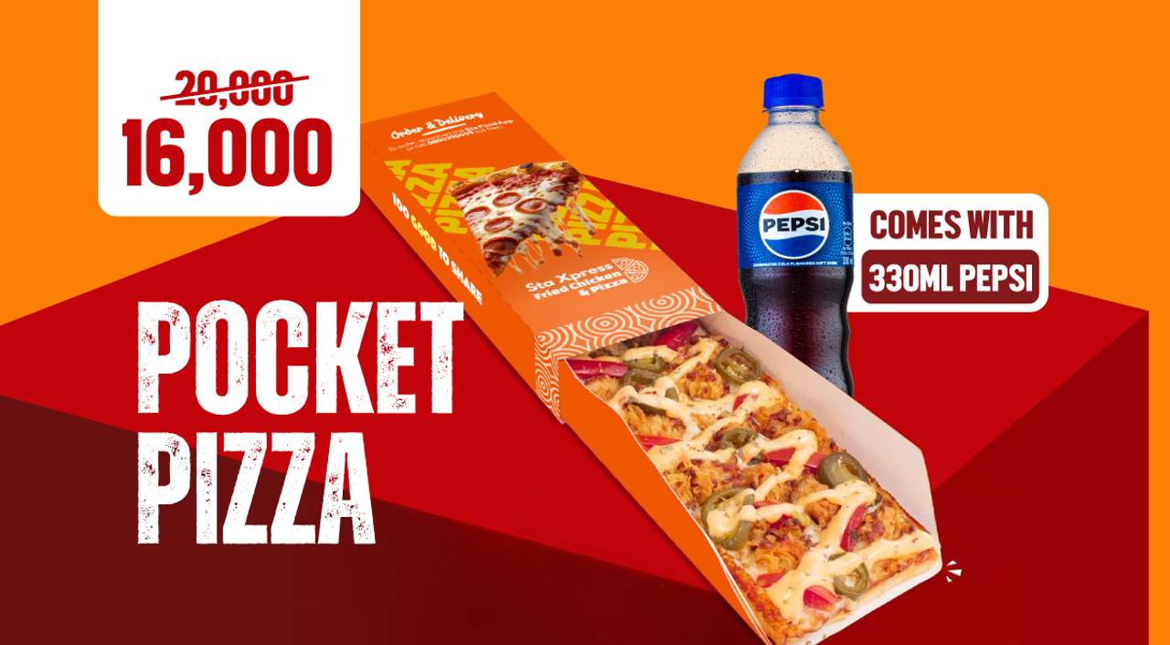 A delicious rectangular pizza made for quick on-the-go enjoyment-Chessy,flavorful and perfectly satisfying served with a 330ml soda