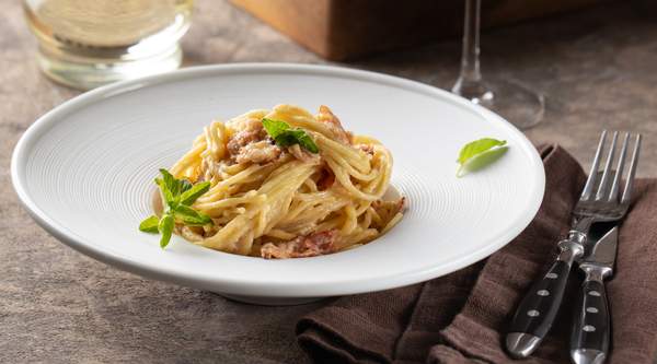 паста, шунка, сос Бешамел, масло, чедър, подправки