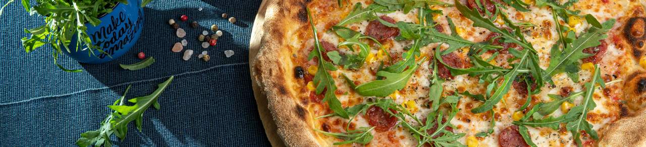 Доматен сос, моцарела, пушена скаморца, чери домати, рукола, риган