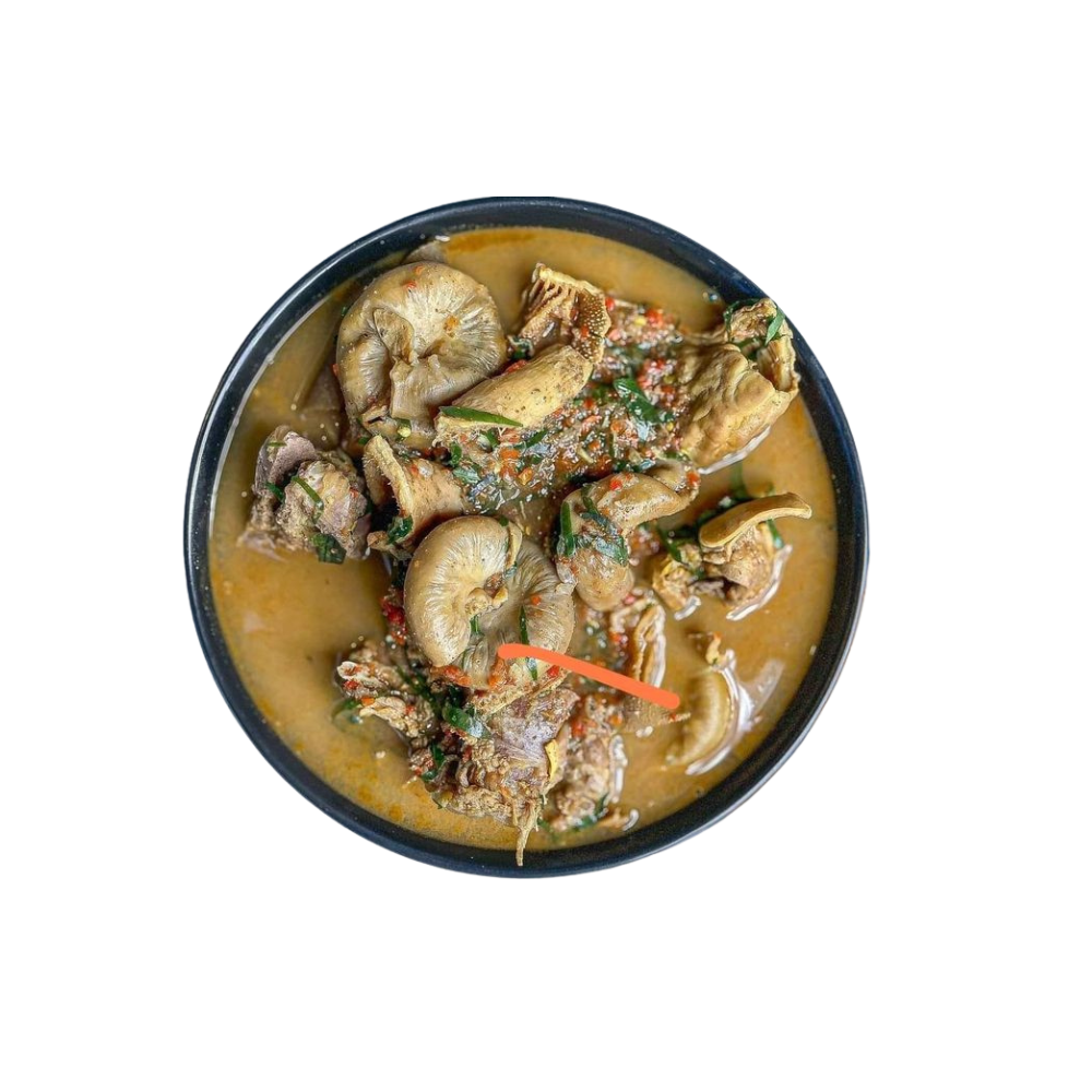 Sauce faite de jus de la graine de palme avec viande de bœuf ou brochet fumé ou patte de bœuf ou agouti ou biche ou hérisson et un accompagnement au choix