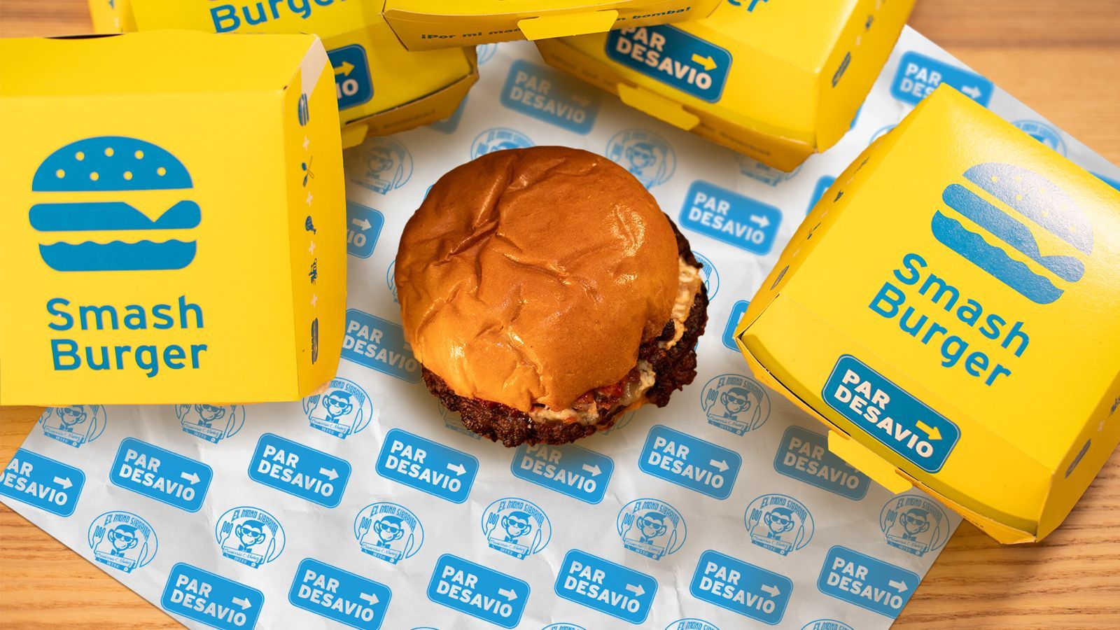 x1 smash burger (90g) + cebolla + pepinillo + salsa Par Desavio + Keptchup Heinz