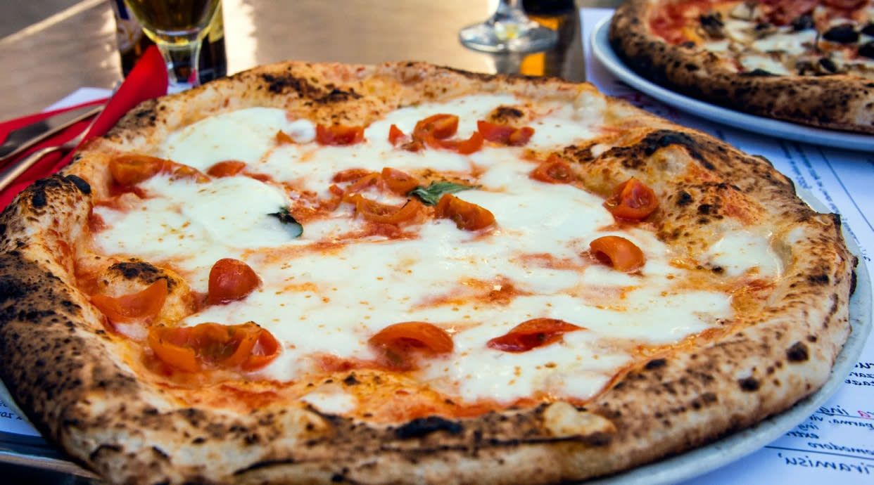 Con atún, gambas, mejillones, ajo, cebolla y mozzarella con tomate