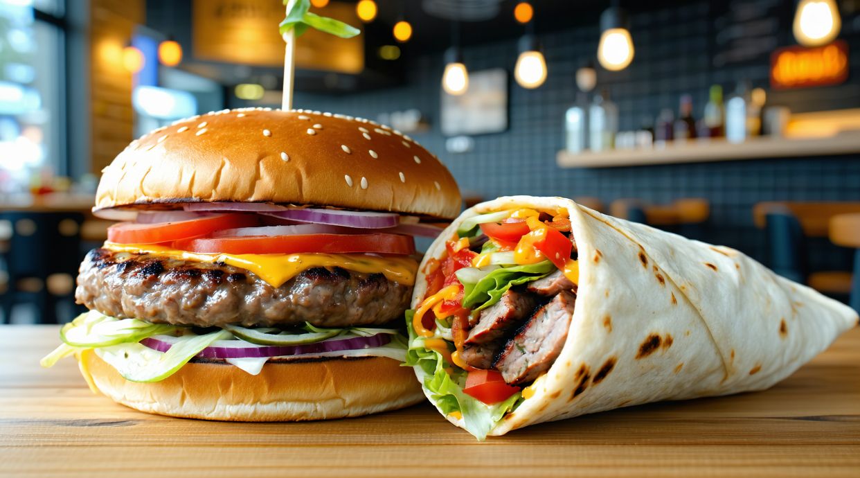 Durum relleno de ternera o pollo, con lechuga, cebolla, tomate, oliva, maíz y patatas fritas dentro