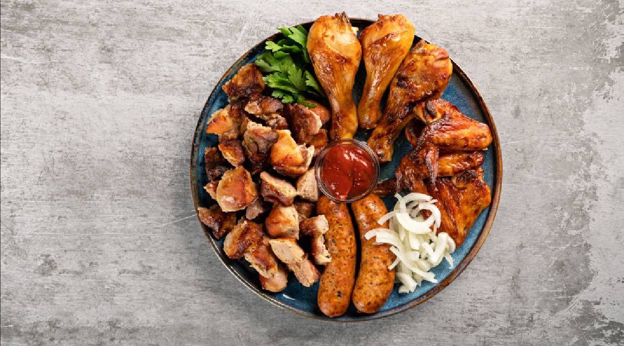 1/2 Pollo, churrasco, picaña, 2 criollos y 1 morcilla +patatas fritas y mazorca
