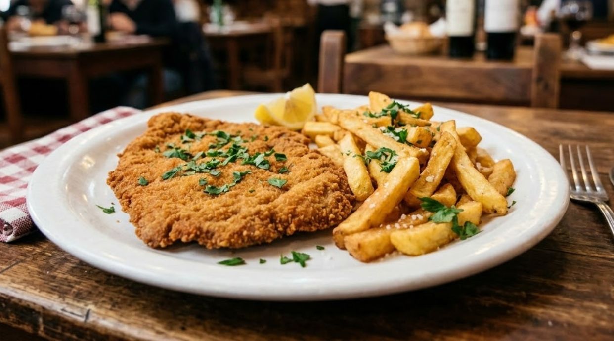 Milanesa de carne o pollo, huevo frito y patatas del club