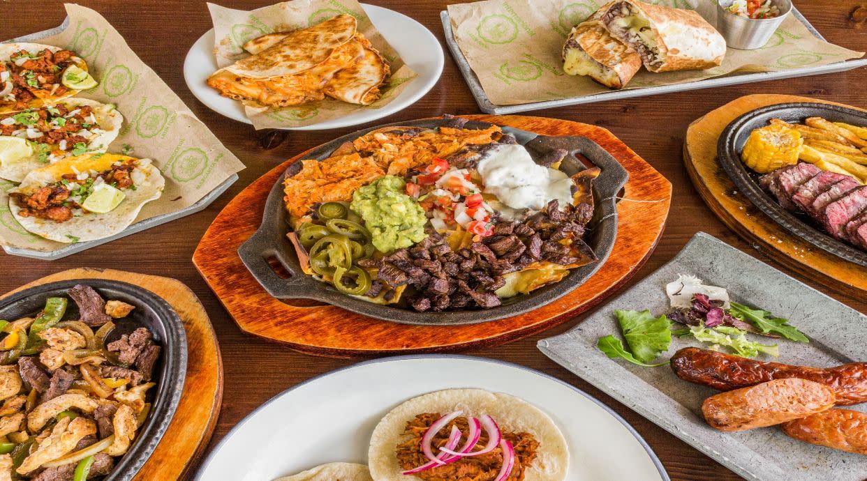 De maíz mexicano, frijoles, guacamole, crema, queso, jalapeños y pico de gallo.