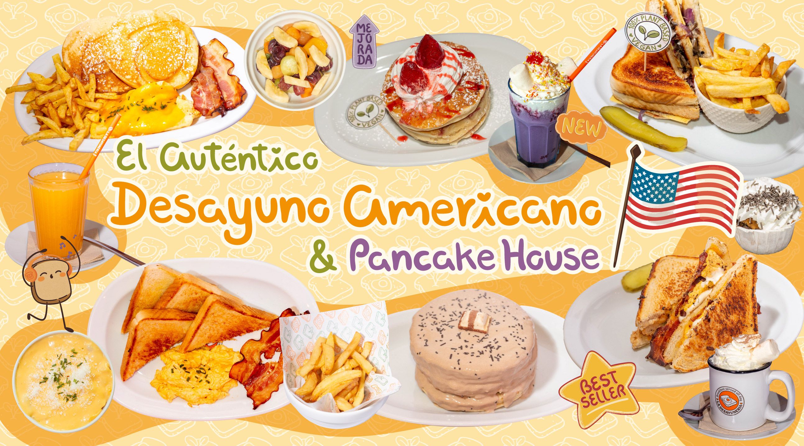 El plato estrella de La Desa, el que es lo más. Pancakes caseros, patatas fritas caseras, huevo revuelto receta especial, queso cheddar y crispy bacon.