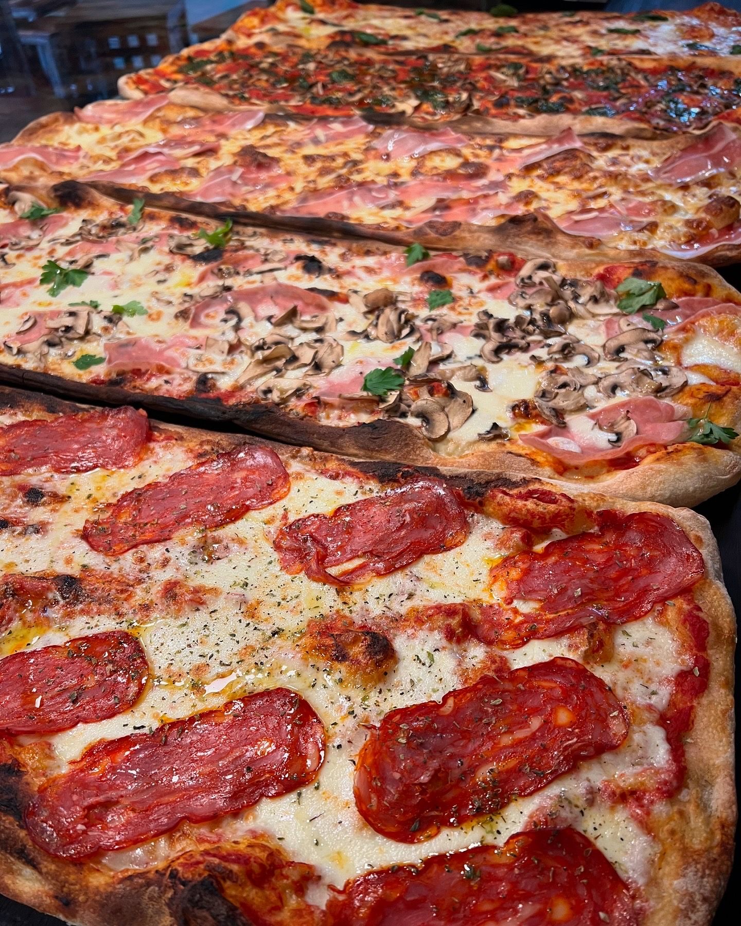 Tomate, mozzarella, champiñones. jamón dulce y perejil