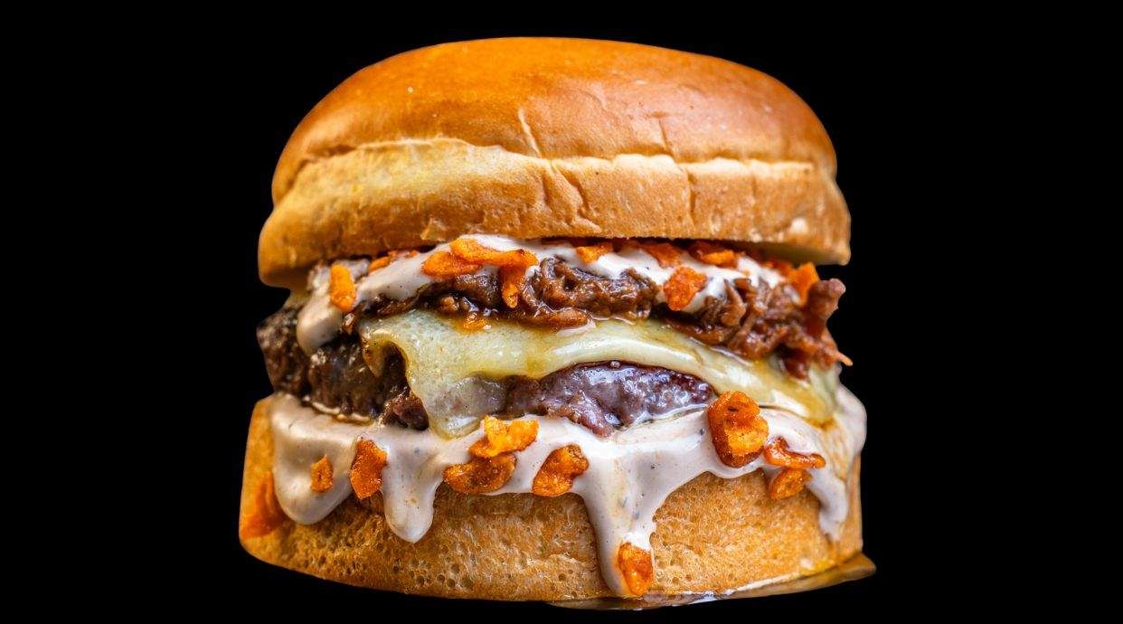 La burger que soñaba ser croqueta! 2 carnes smash 80gr, x2 queso edam, bechamel de Jamón, mayonesa japonesa, polvo de kikos y cebolla carameliza. OUU MAMA!