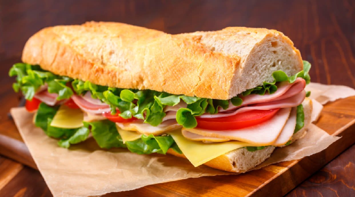 Bocadillo de jamón york, queso, lechuga, tomate, cebolla crujiente, atún y huevo cocido