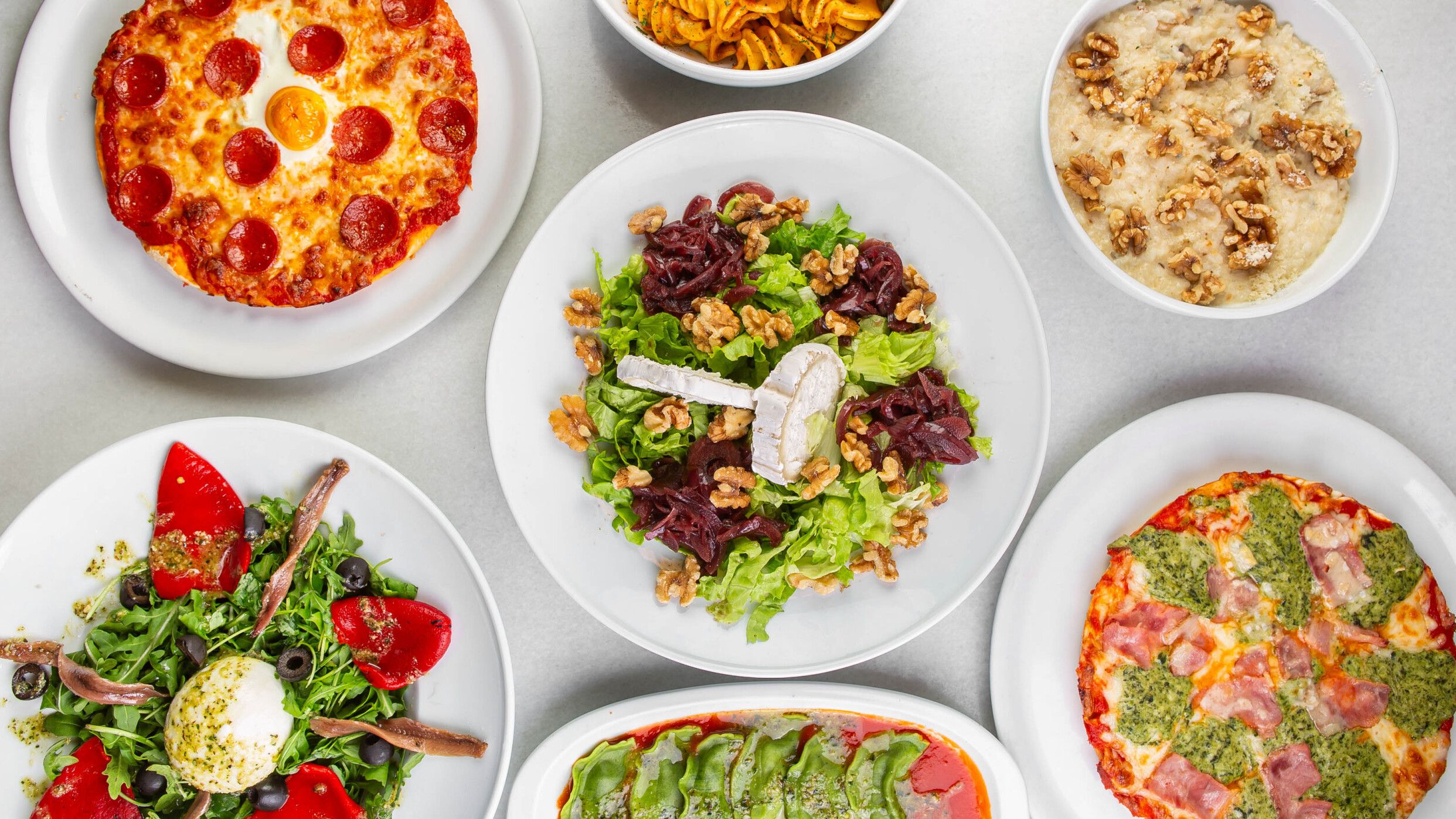Con lechuga, queso fresco, aceitunas negras, cebolla, pimiento rojo, tomate, orégano y pimienta.