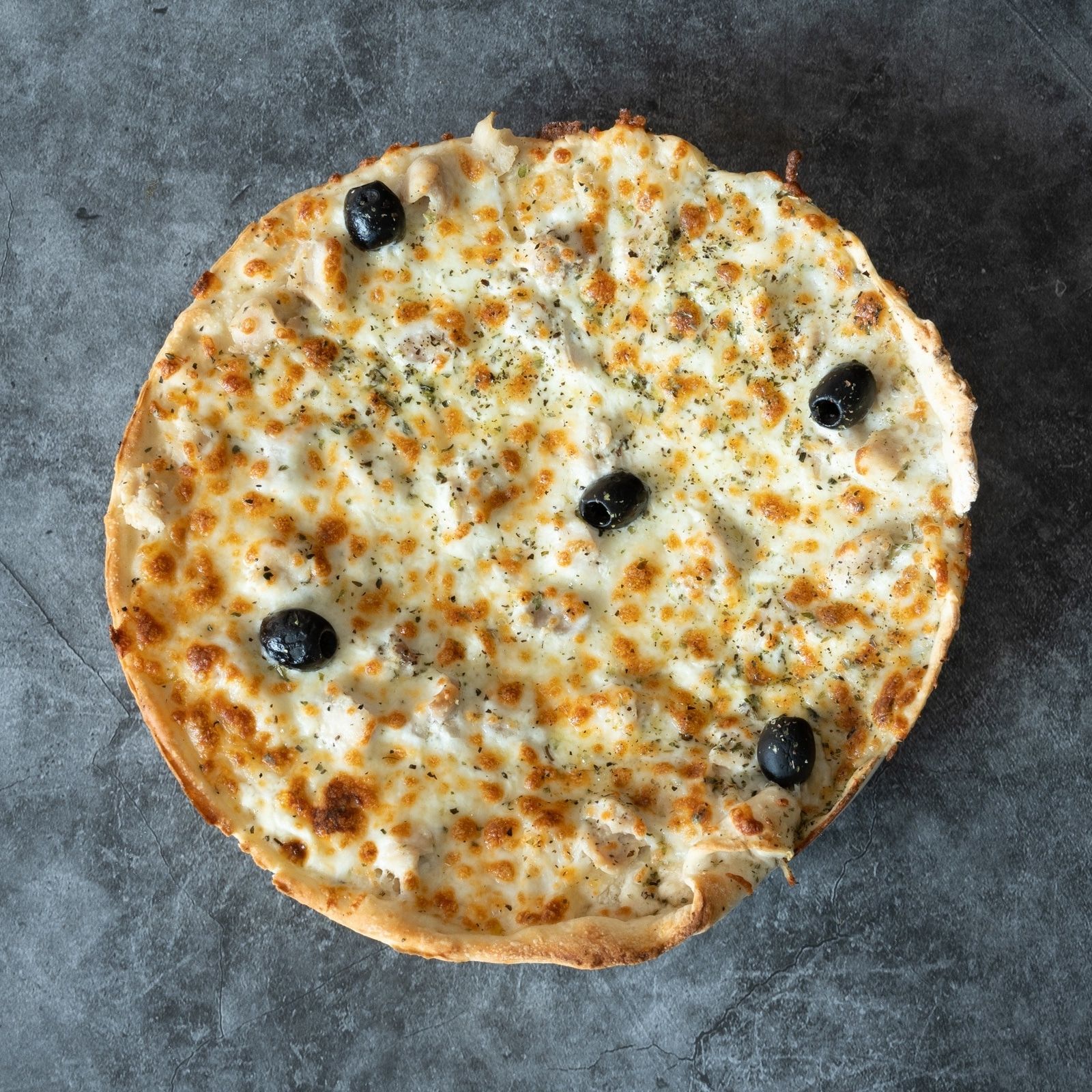 Tomate, champiñón, pimiento rojo, pollo, mozzarella, olivas, orégano