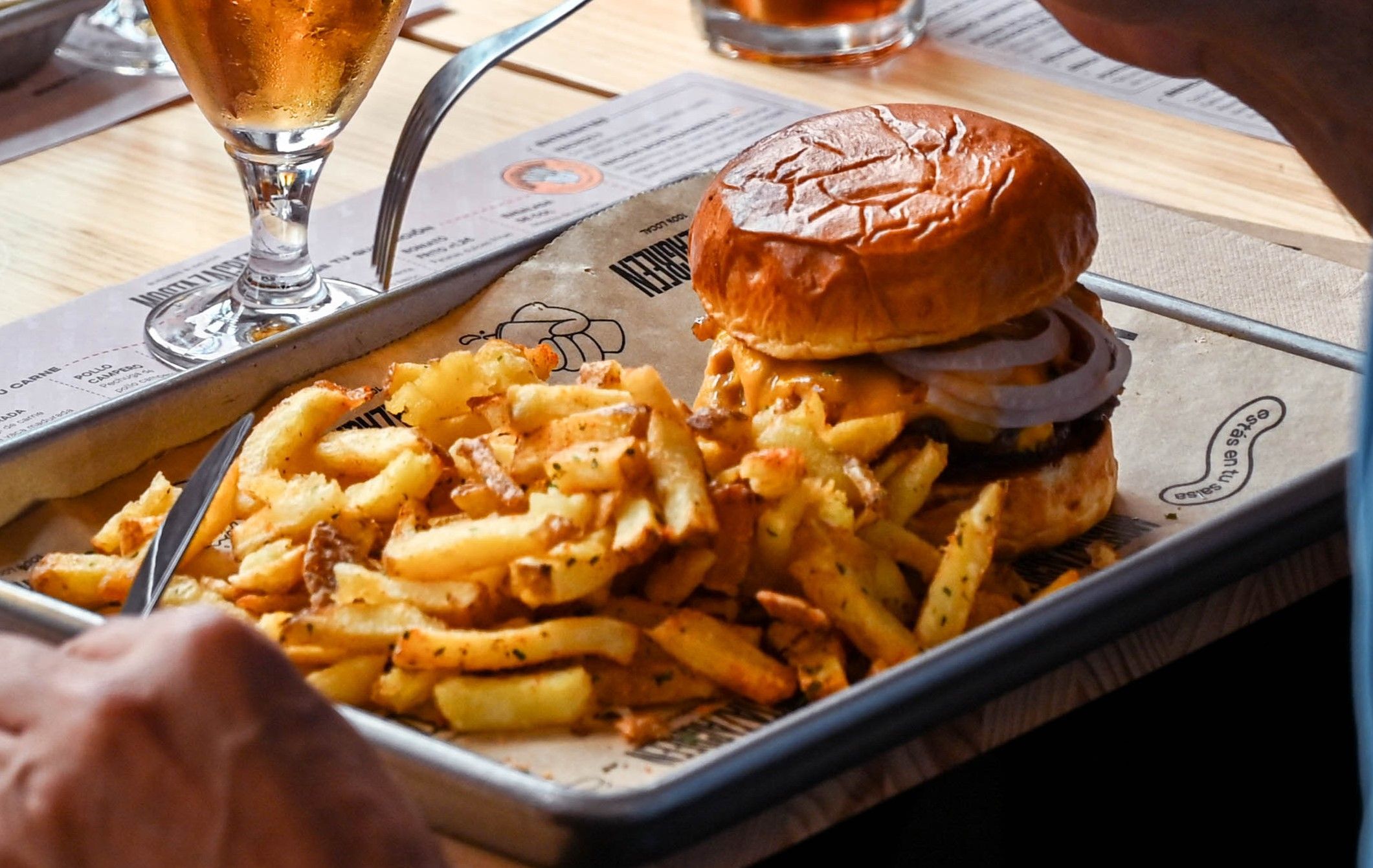 Pan brioche, doble de carne de 90gr, queso cheddar fundido, salsa burger, bacon, pepinillo y cebolla morada.