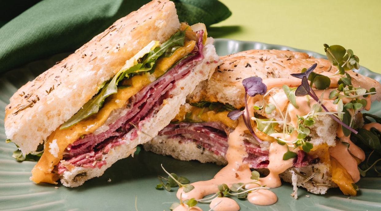 Pan de masa madre relleno de pastrami de ternera, mostaza de Dijón, queso fundido, cebolla caramelizada, rúcula, salsa sriracha mayo y pepinillo