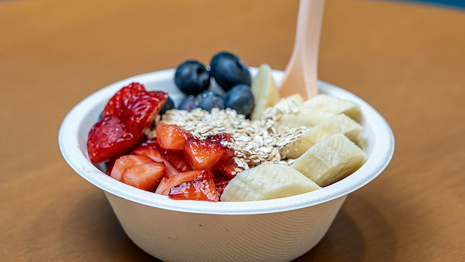 acaí, fresas, mango, arándanos, granola, miel y menta