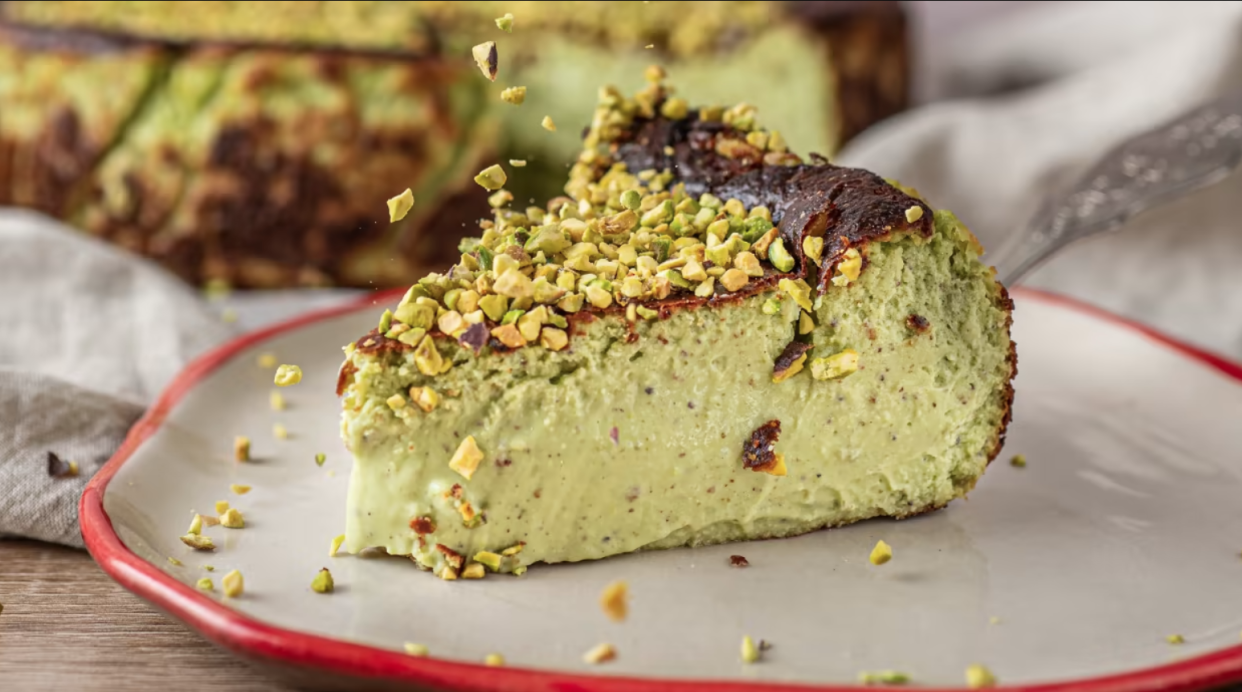 Elegante y sofisticada Cheesecake hecha al horno con crema 100% de Pistacho ibérico, una deliciosa cobertura de Nocciolata premium y crujiente pasta Kataifi artesanal.