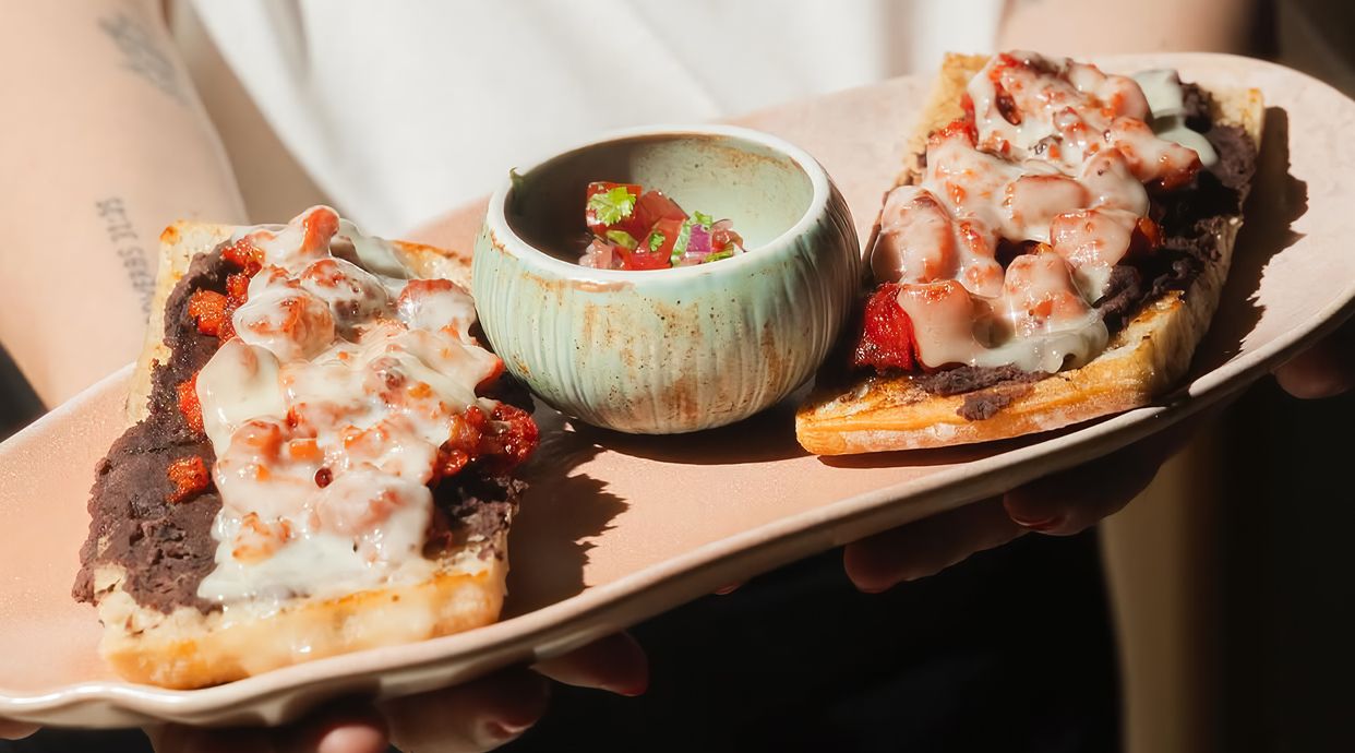Pan cristal con frijoles refritos y proteína de tu elección (chorizo o bacon o jamón de pavo). Gratinados con queso Havarti