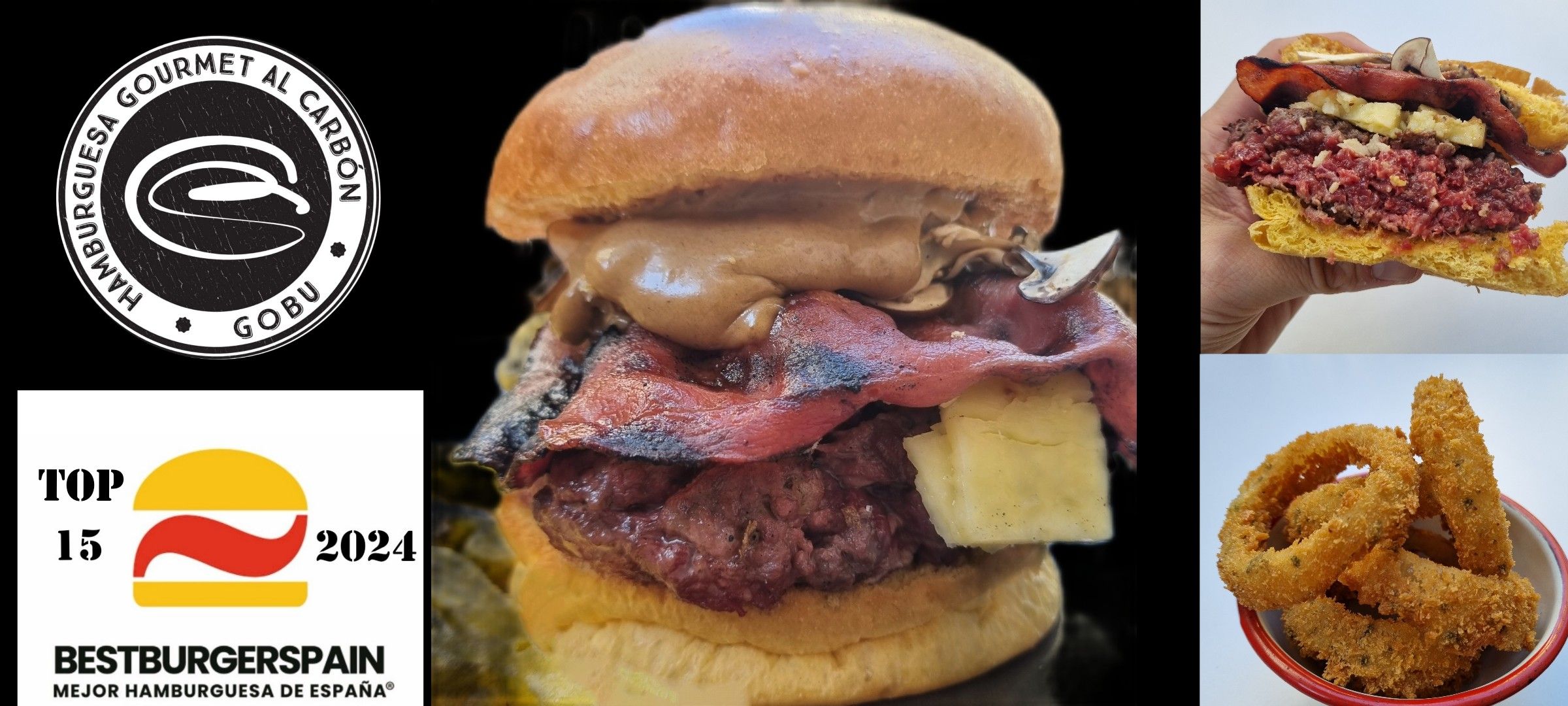 TOP 15 BEST BURGER SPAIN 2024. 190 grs de carne hecha al carbón madurada 30 días con pan brioche, mayo de ajo negro, , bacon, cheddar vintage, champiñón portobello al carbón y guarnición a tu elección.