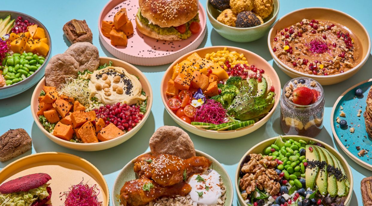 Base de quinoa y hummus con topping de aguacate, pepino, brócoli, dados de boniato asados, tomates cherry, maíz, dados de mango, semillas de sésamo, aderezo de salsa tahini y brotes de remolacha. Alérgenos: Sésamo.